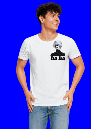 Premium white polyester t-shirt with ‘ha ha’ anime graphic print – bold design for those who love to stand out. Soft, lightweight aur wrinkle-free fabric jo deta hai all-day comfort aur stylish fit.